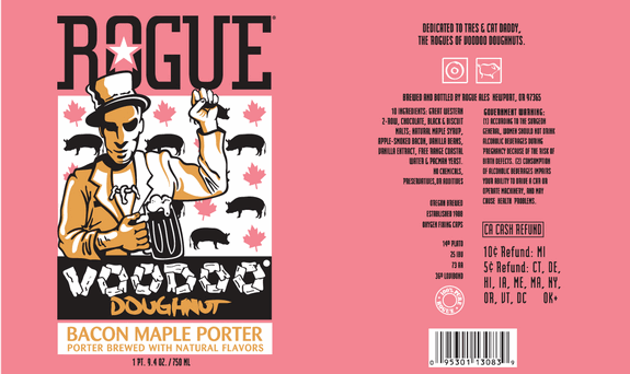 Well, just across the craft beer wire, Newport, OR-based Rogue Ales they got label approval for their new Voodoo Doughnut Maple Bacon Porter in tribute to Voodoo’s maple bacon bars. It’ll be out in 750mL bottles and is made with maple syrup, apple-smoked bacon and vanilla beans…