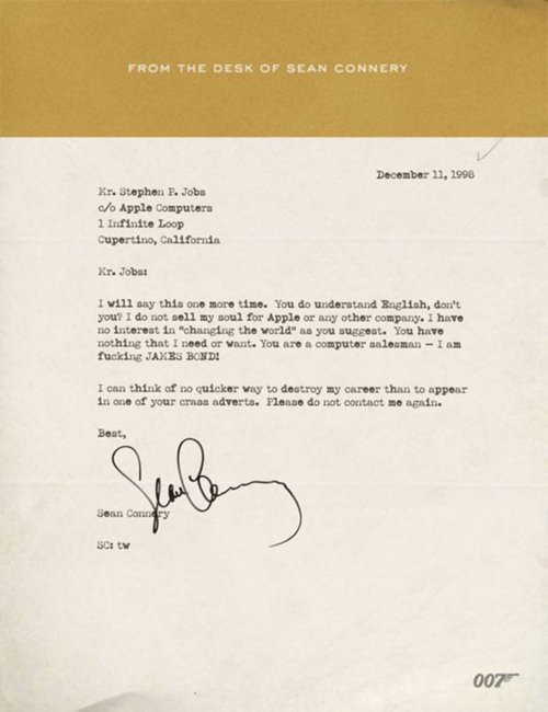 Next from the desk of Sean Connery to Steve Jobs of Apple…