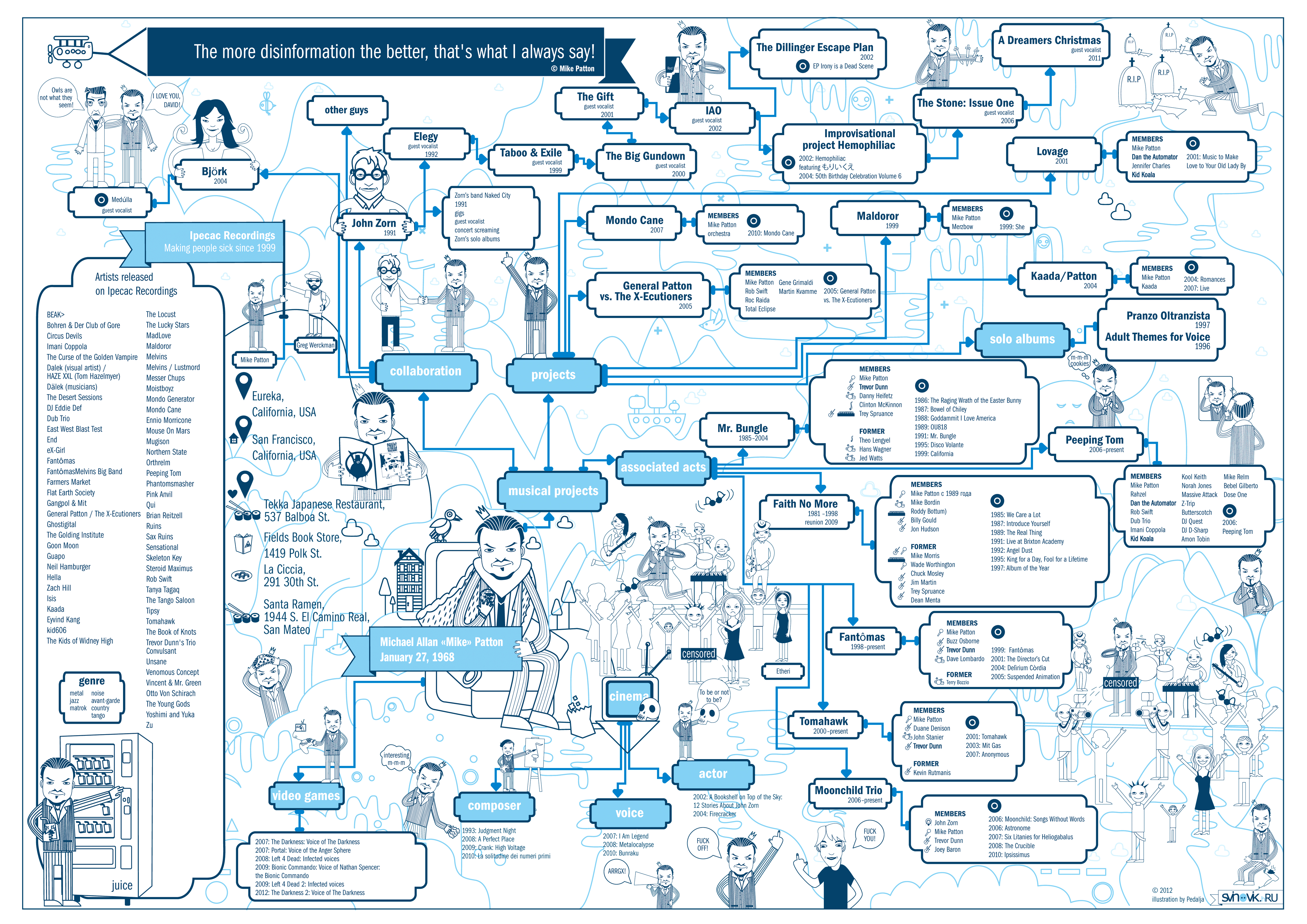 Mike Patton, a founding member of Mr. Bungle and a replacement member for the more successful Faith No More, goes far beyond those two bands. Even before the start of his label Ipecac Recordings, and definitely continuing afgterwards, his offshoots and one-offs are VAST… this Mike Patton infographic tries to tie the history down through now…